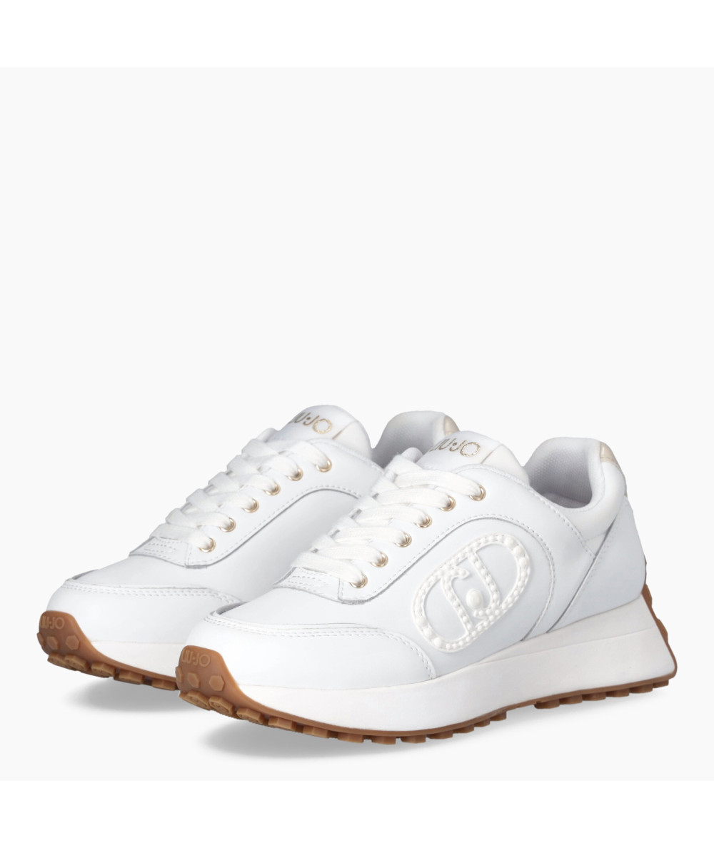 Sneakers con tomaia in pelle White e logo decorativo con perle bianche, altezza suola 5 cm.