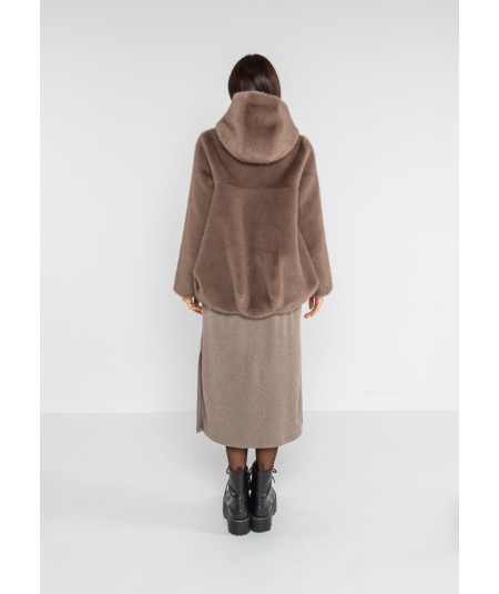 La giacca presenta un design elegante e moderno, realizzato in morbida pelliccia sintetica dal colore taupe/marrone tortora, dall’aspetto soffice e uniforme. La texture è liscia e compatta, conferendo al capo un effetto lussuoso e avvolgente.