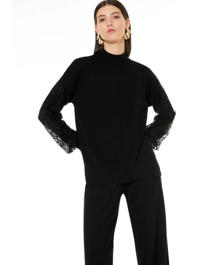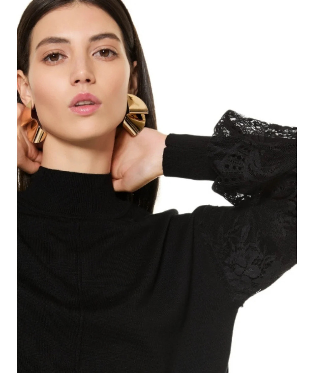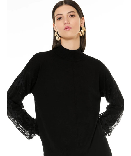 La maglia girocollo con maniche a palloncino si distingue per i dettagli in pizzo tono su tono, che impreziosiscono il design con eleganza discreta. Realizzata in morbida viscosa, è il capo ideale per look femminili e sofisticati.