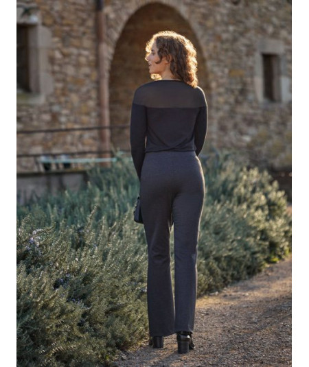 Il pantalone è un modello elegante e dal taglio dritto, realizzato in un tessuto dall’aspetto compatto e leggermente elasticizzato, ideale per valorizzare la figura senza rinunciare alla comodità.